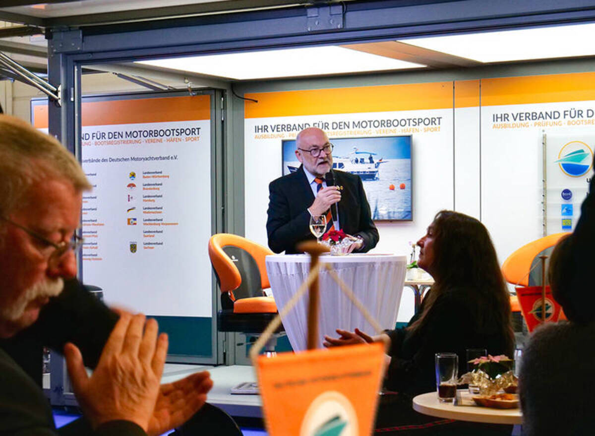 DMYV-Vizepräsident Gisbert König und MVB-Präsident Alexander Raths begrüßten die Gäste aus den Verbänden, den Berliner Vereinen sowie aus der Politik. Im Rahmen des Empfangs wurde Jörg Feske, 2. Vorsitzender des MC Grünau, für sein Engagement im motorisierten Wassersport durch den Motoryachtverband Berlin mit der Ehrennadel des Landesverbandes ausgezeichnet. Jörg Feske war unter anderem im Rennsport aktiv und fuhr bis 2017 in der 250er Klasse.