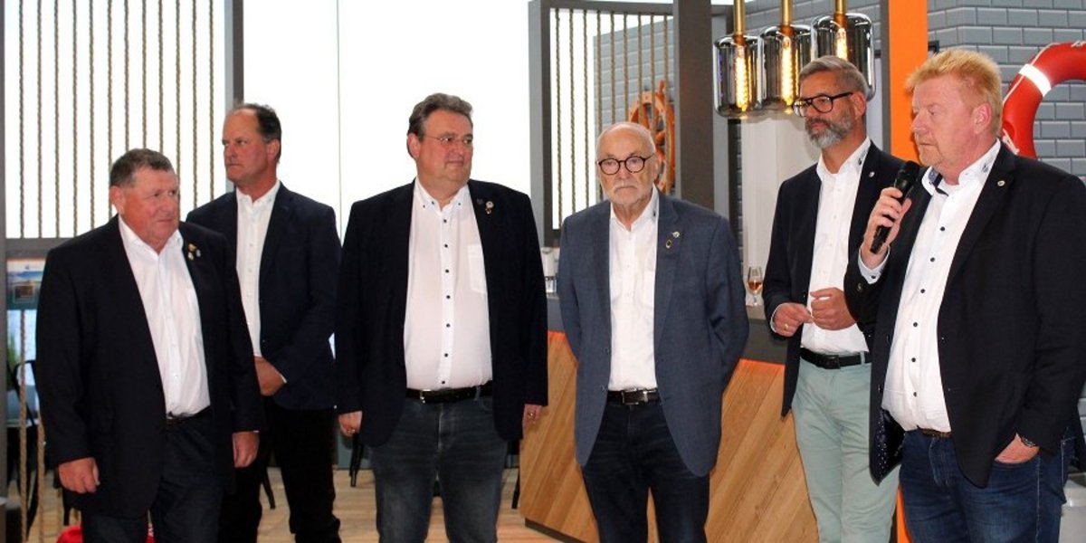 Am Samstag, dem ersten Messetag war es so weit; DMYV-Präsident Frank Dettmering, der 1. Vizepräsident Gisbert König, LVM-BW-Präsident Michael Martini und der Vorsitzende der SBV, Sven Greif, waren zum Standempfang nach Friedrichshafen gekommen und eröffneten offiziell den „Heimathafen“, den neuen Messestand des Deutschen Motoryachtverbands.