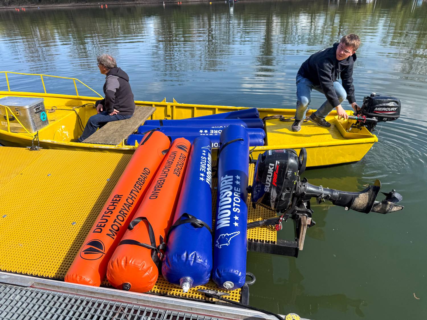 Anker, Gegengewichte für die Ankerleinen sowie zusätzliche Gewichte an den Bojen sorgen für einen stabilen und aufrechten Stand im Wasser. Die materielle Grundlage für das Projekt wurde gemeinschaftlich geschaffen: Der Deutsche Motoryachtverband und der MotoSurf Store stellten jeweils 50 Prozent des benötigten Materials für den Bojenkurs bereit.