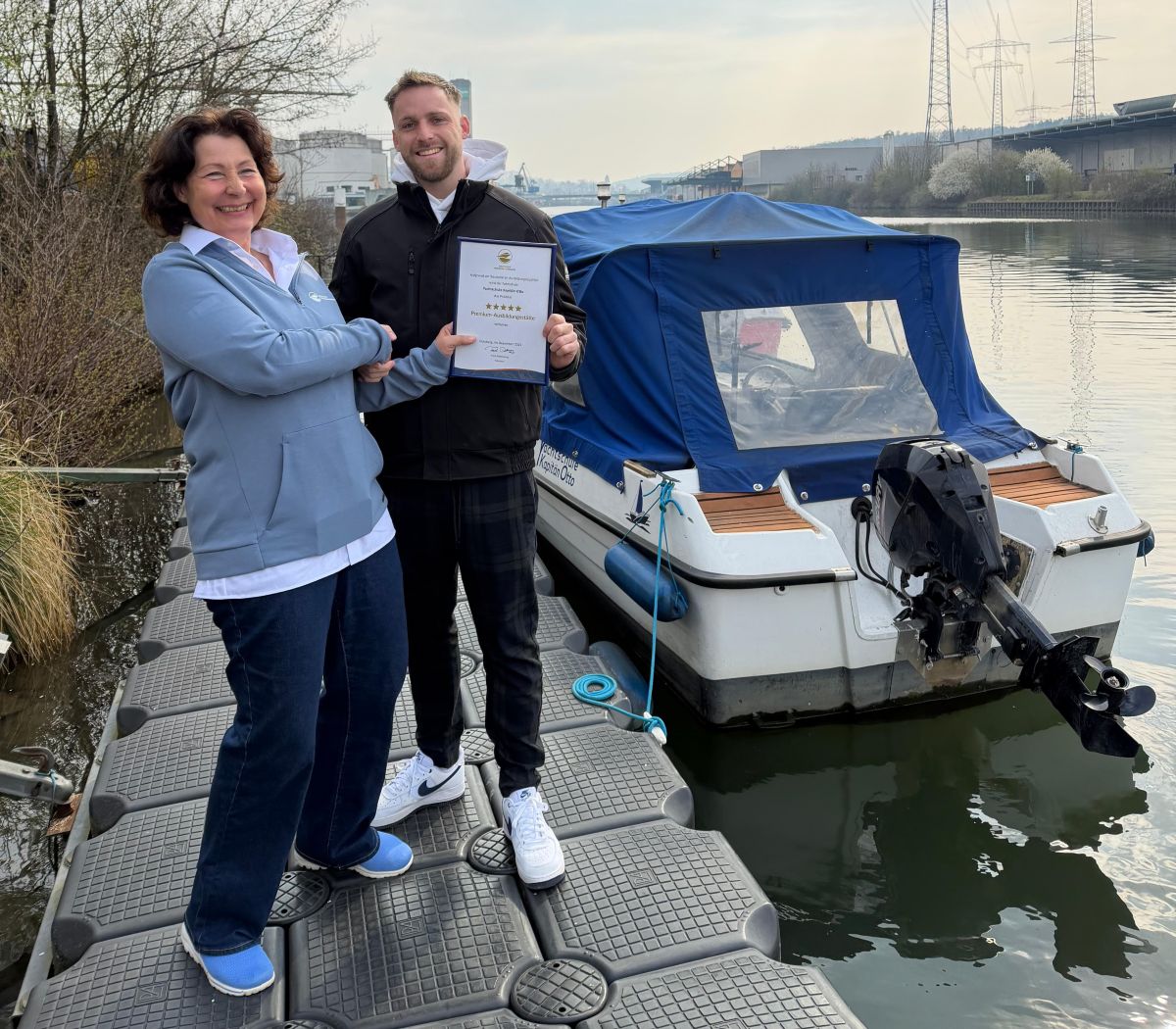 Die Leiterin des DMYV-Prüfungszentrums Bodensee, Stuttgart & Ausland, Barbara Pfänder übergab die Urkunde an Dominik Otto. Seit 1979 ist die Yachtschule Kapitän Otto bereits eine vom DMYV anerkannte Ausbildungsstätte, jetzt hat die Ausbildungsstätte aus Plochingen nochmal nachgelegt.